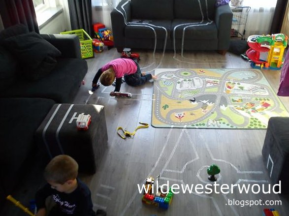 Neem een rol schilderstape en plak een heel weggennet op de grond. Je hoeft het daarbij natuurlijk niet te laten. De bank, kruk, tafel, alles kan onderdeel uitmaken van je weggennet.