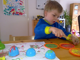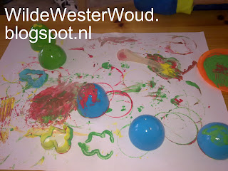 Met de paaseieren had hij dikke pret. Natuurlijk bleef het niet bij stempelen. Al heeft hij nog steeds een hekel aan vieze handen, de eieren werden ook beschilderd.